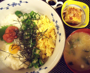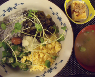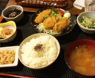 ご飯、汁物、本日のおかず、小鉢、ミニデザート